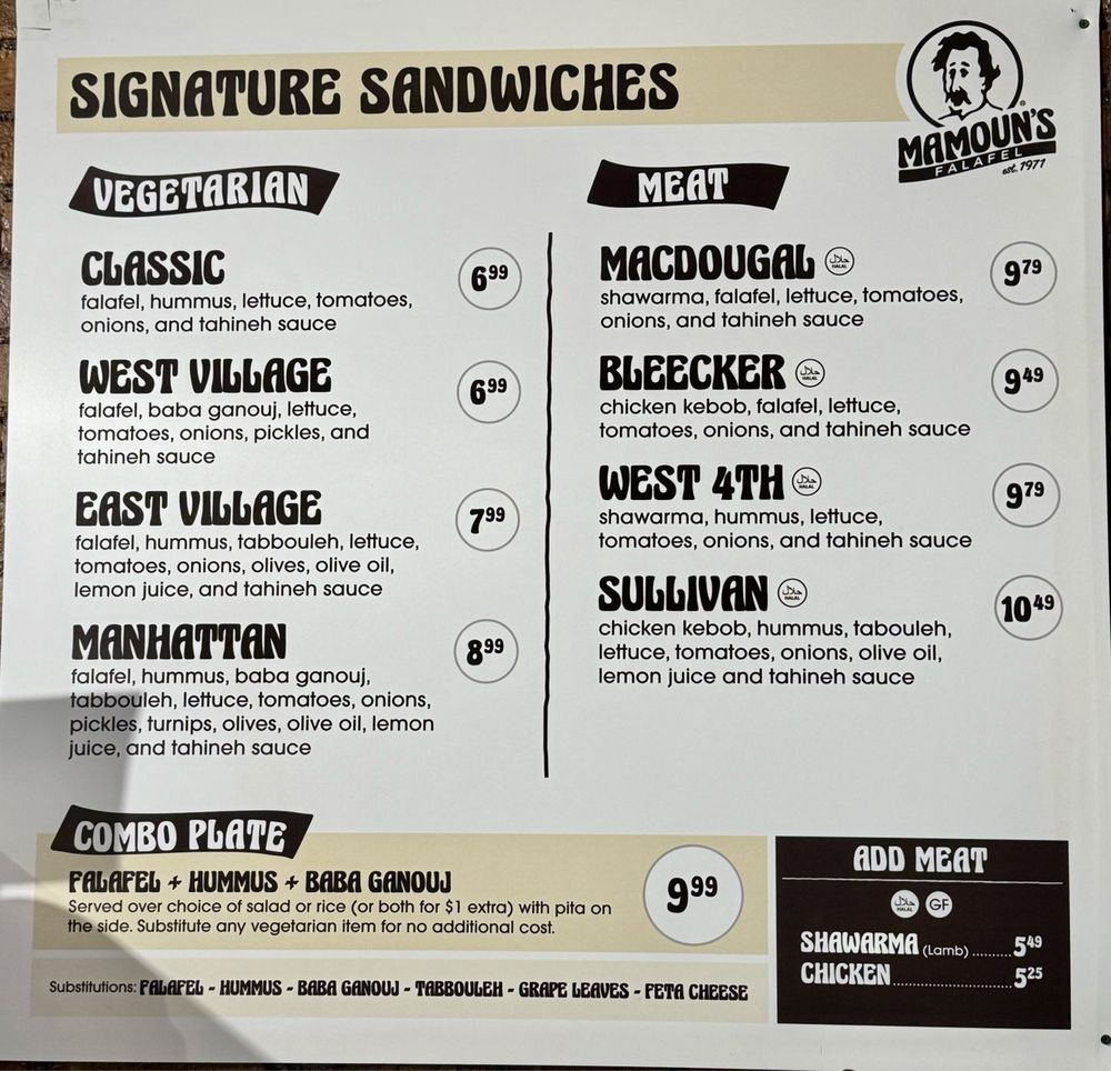 Welcome to Mamoun’s Falafel, a cherished destination in the bustling East Village of New York City, specifically located at 30 St Marks Place. Mamoun’s specializes in Middle Eastern cuisine, offering a delightful menu of sandwiches that are perfect for any time of day, whether it's lunch, dinner, or a late-night snack.